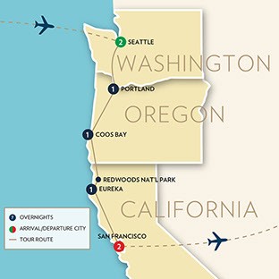 Enjoy the beauty of the Pacific Coast from Seattle through Oregon to San Francisco